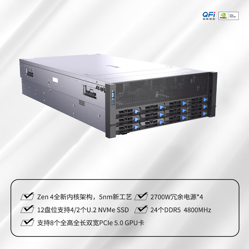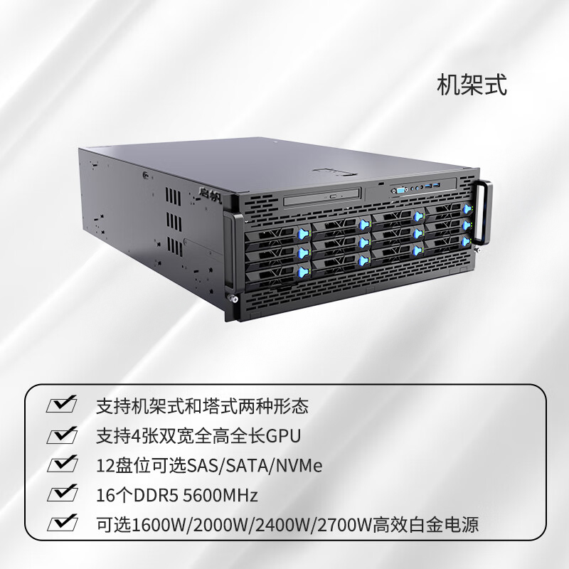 4U 服务器以 175mm 标准机架高度为基础,聚焦极致性能释放与超强扩展能力,是企业核心业务、大规模数据存储及重型计算场景的旗舰级硬件方案。其支持双路 / 四路高性能处理器架构,搭配最多 24 条 DDR5 内存插槽与多组 PCIe 5.0 扩展通道,单台可实现最高 12TB 内存容量与 60 块硬盘的存储配置,轻松承载数据库集群、虚拟化平台、AI 训练等对算力和存储有极致需求的核心工作负载。