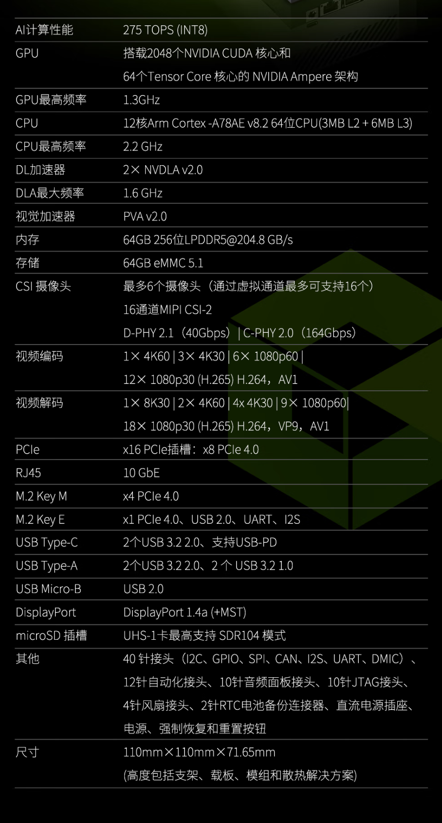 该开发套件旨在帮助开发者轻松上手 Jetson AGX Orin 模块,其外形紧凑、接口丰富,具备高达 275 TOPS 的 AI 性能,非常适合先进的 AI 机器人和其他自主机器的原型制作。