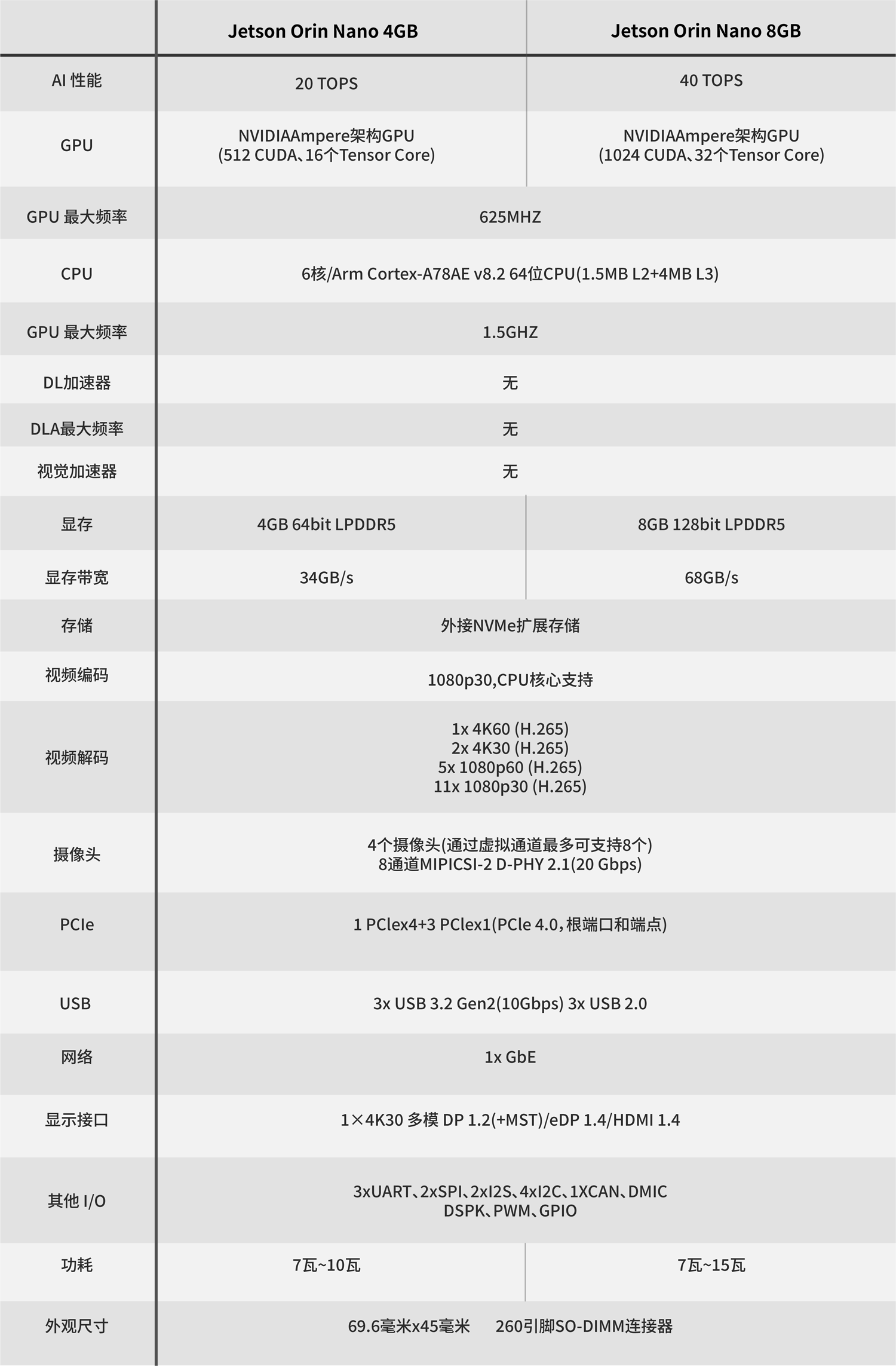Jetson Orin Nano 4GB Module 适用于入门级边缘 AI 开发,包括小型服务机器人、教育科研实验、轻量智能视觉检测(如简单物体识别)、便携式 IoT 设备(如手持巡检终端)、入门级无人机辅助感知等场景。