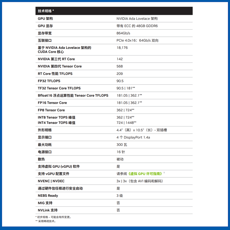 第四代 Tensor Core 覆盖 FP8~INT8,FP8 稀疏可达 724 TFLOPS,适配 Stable Diffusion、Llama 2 等生成式 AI 与 LLM 推理 / 微调。48GB ECC GDDR6+864GB/s 带宽,支持更大模型与批量,满足 LLM 推理、推荐系统与科学计算密集访存需求。