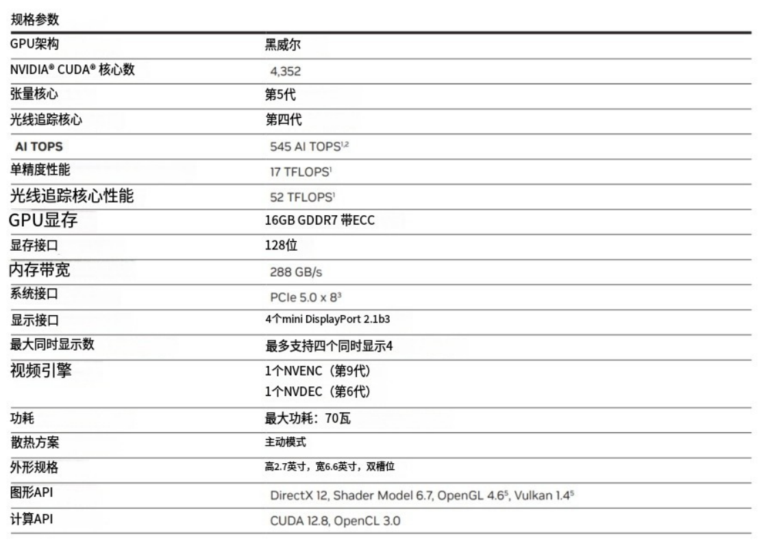 支持 PCI Express 第 5 代,具备 NVENC/NVDEC 编解码器,支持 MAX-Q 技术,在光线追踪、AI 加速和图形渲染等任务中可提供高效算力。