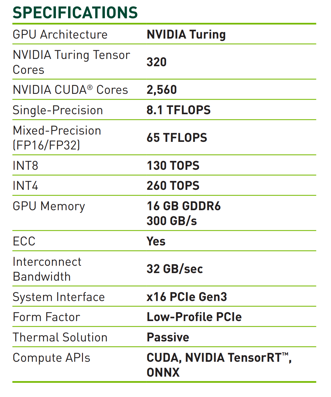 多精度推理:第 2 代 Tensor Core 支持 FP16/INT8/INT4 稀疏,INT8 下吞吐量可达数千 QPS,适配 BERT、ResNet、MobileNet 等中小模型。视频处理:双 NVDEC + 单 NVENC,硬解 38 路1080p@30,支持 4K@60 10b 编码,适合智能监控、直播转码与内容审核。图形与虚拟化:第 1 代 RT Core + 光追,支持 vGPU 与 MIG(有限制),适配云游戏、虚拟工作站(vWS)与数字孪生渲染。 低功耗高密度:70W TDP,被动散热
